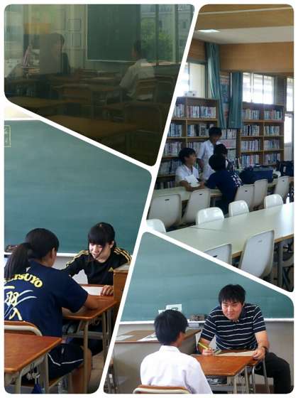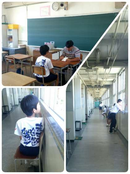 本日も教育相談をしています。待機は各学年ごとに集められ、自習をして自分の番を待ちます。廊下を見渡すと、たいていの人が窓越しに中庭の方を見ていました。