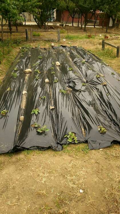 多くの雑草に悩まされた菜園ですが、植えた野菜の周りに黒いビニールを敷き詰めました。真冬ならこれが熱を吸収し、土を温め、植物の成長を促す効果があります。