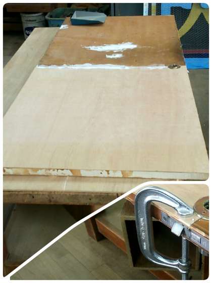 ノブ周りは板が浮いてくるので、接着剤が乾くまでクランプで固定しています。