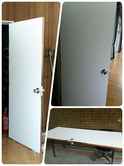 表面を滑らかに削った後、きれいに白色の塗装が施され、体育館の倉庫に再び取り付けられました。