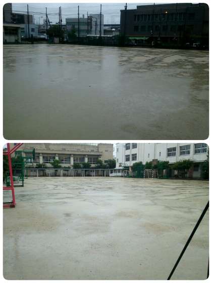 今朝は昨晩からの雨でグラウンドも水浸しです。