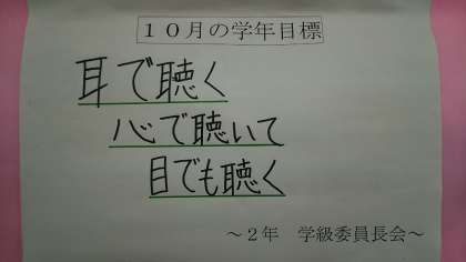 さて、木曜日は2年生定例の学年集会です。委員長会の人から今月の学年目標「耳で聴く 心で聴いて 目でも聴く」がみんなに知らされました。「今、この場でも下を向いている人がいます。」とみんなに訴えかけていました。