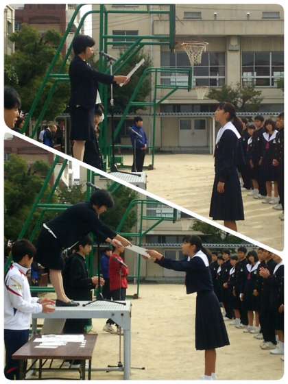 柔道部は先日の大阪中学校秋季柔道大会の女子個人戦第3位と男子団体準優勝の表彰でした。