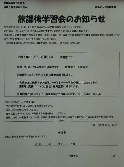 昨日、3年生には元気アップさんより11月8日からの放課後学習会のお知らせが配布されました。