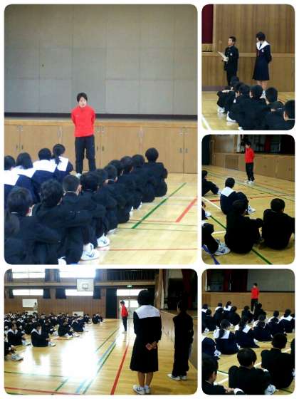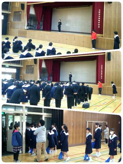 北田先生からは「昨日は雨が降り、みんなの安全面と健康面を考えた結果「大和川ウォーキング」は中止にしました。頑張って歩いてみようと意気込んでいた人もいたし、「なんで〜!」と言って残念がってる人もいましたが、さっきの池尻先生の話ではないけど、「天気が悪いのは誰の責任でもないやん!」とか「いつまでも言ってても仕方ないやん!」とどんよりした雰囲気を変えてくれる人がいました。その言葉の連鎖に助けられました。「大和川ウォーキング」は中止になりましたが、この後は期末テストが控えています。中間テストのときに準備が遅かったと思った人は、今日から準備をして期末テストに備えてください。」という話がありました。