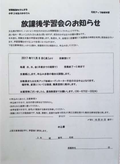 元気アップ事業として、3年生対象放課後学習会を、毎水・木・金に実施しています。
