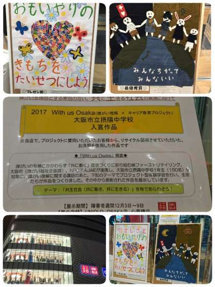 先日お知らせした、1年生がキャリア教育学習で作成した作品がユニクロOSAKA店、心斎橋店それぞれに展示されていました。作品は今週土曜日まで展示されています。