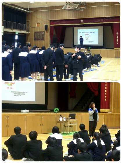 さて、その6時間目、3年生は体育館に入り、平野区保健福祉センターの保健師さんからエイズについてや性感染症についての講話を聞きました。