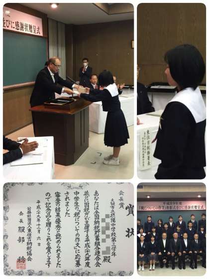 昨日、東住吉納税協会で「税についての作文」の表彰式並びに感謝状贈呈式がありました。本校からは3年生の女子1名がそれぞれ「公益財団法人東住吉納税協会長賞」をいただきました。
