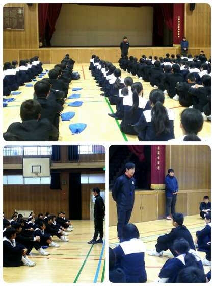 平賀先生からは来週に控えた進路懇談に向けて、「みんなは来週の懇談で決断をしていかなければなりませんが、しっかりと考えたうえで進路選択をしてください。先生も当然みんなと同じ時期がありました。英語が好きで、できるという自信もあったので国際教養科に進みましたが、実際に進学してみるとレベルが高くて挫折を味わいました。英語の教師になるのは厳しいと思いましたが、そこで体育の先生だったバスケットボール部の顧問の先生との出会いがありました。とても良い先生で、その先生との出会いから体育の教師になろうという気持ちになり、現在に至っています。」「良い出会いとは自分としっかり向き合いながら日々過ごしていなければ、勝手にやってくるものでは無いと思います。残念ながら高校に進学してやめてしまうという人が少なからずいます。そういう人に「しっかり考えて進路選択したんか?」と聞くとたいていは「そんなに真剣に考えなかった…」という答えが返ってきます。そうならないためにも自分としっかり向き合い、進路についてしっかり考えてください。」という話がありました。