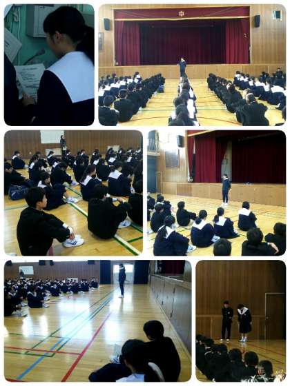 さて、本日は1年生定例の学年集会でした。委員長会の人からは二学期の締めくくりをしっかりしていきましょうと呼びかけがありました。