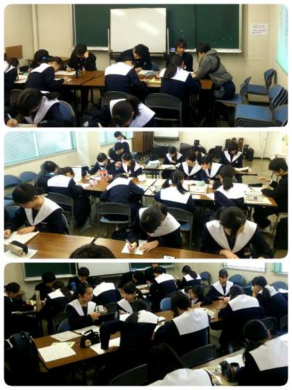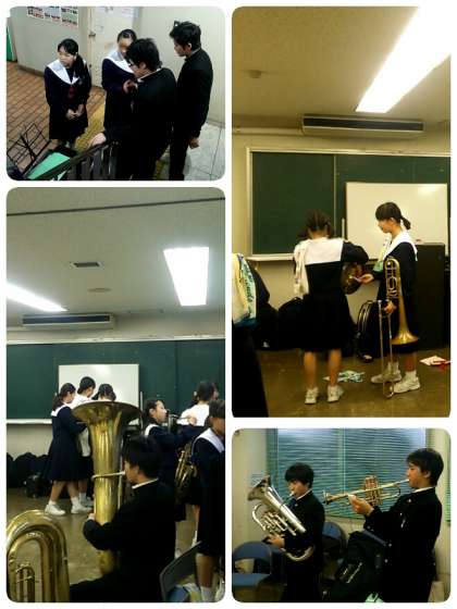 午前中に会場のイス並べをし、中学校に戻って練習をし、再び区民ホールへと向かいました。途中、本番までに時間がありましたので、みんなで机を並べて宿題をしました。