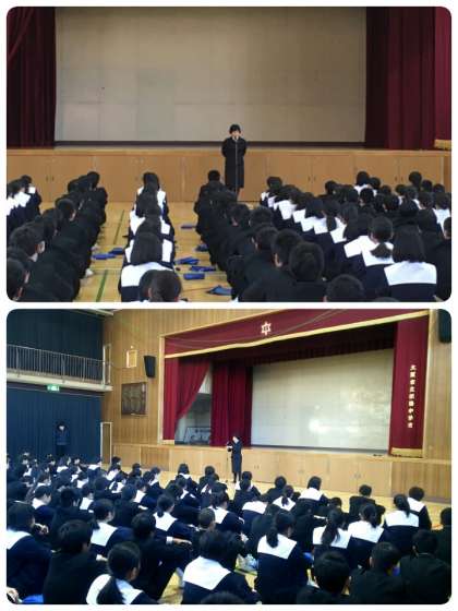 校長先生からは「2学期を振り返ってみると、行事や体験学習、ボランティア活動などたくさんありましたが、それぞれの場面で、皆さんが力を発揮してくれ、大きく成長したと思います。(中学2年生の女の子の新聞への投稿記事を紹介し)皆さんもこの70周年の節目の年に、後輩へ伝えていくこと、大事にしてほしいことをしっかり引き継ぐ3学期にしてほしいです。」「また新年を迎えるにあたり、やはり一つ頑張ること、目標を決めてほしいと思います。一つのことをやり抜くことは大きな力となります。3学期もまた元気に活躍してくれることを楽しみにしています。」という話がありました。