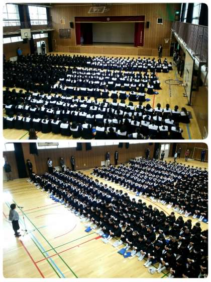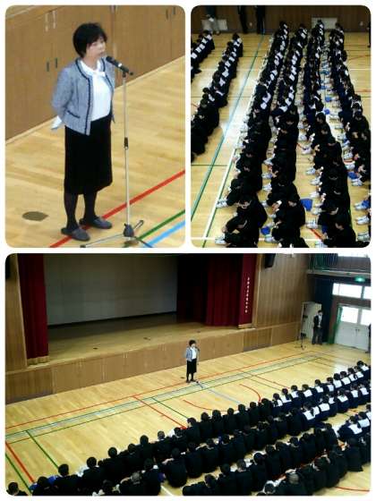 本日は三学期の始業式でした。二学期の終業式は1年生が早く下校することになってしまいましたが、今日は三学年揃っての始業式でした。ただ、昨日の雨でグラウンド状態が悪かったため、体育館で行いました。