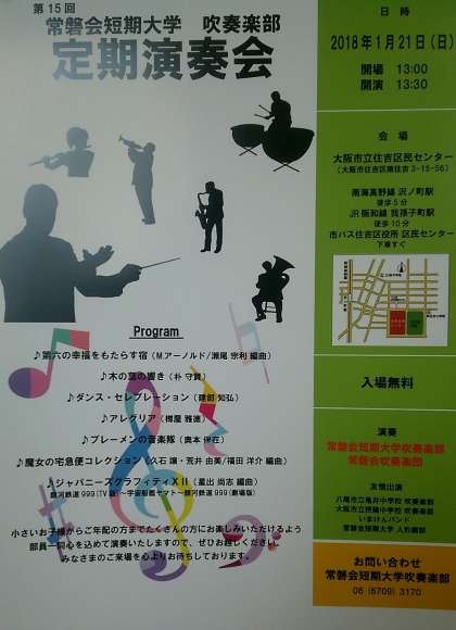 来週21日(日)に住吉区民センターで行われる常磐会短期大学吹奏楽部の定期演奏会のための合同練習会で、常磐会短期大学吹奏楽部の顧問の先生より「校区内にある吹奏楽部の中学生と一緒に演奏を!」ということで声を掛けていただき、合同演奏に参加させていただくことになりました。吹奏楽部の他にも八尾市立亀井中学校吹奏楽部や社会人の楽団の人が参加しています。