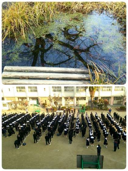 昨日は低温のため、定例の全校集会を見送りました。本日は気温も少し上がり、全校集会を行いました。昨日まで5日連続で凍っていた池の水は久しぶりに凍っていませんでした。