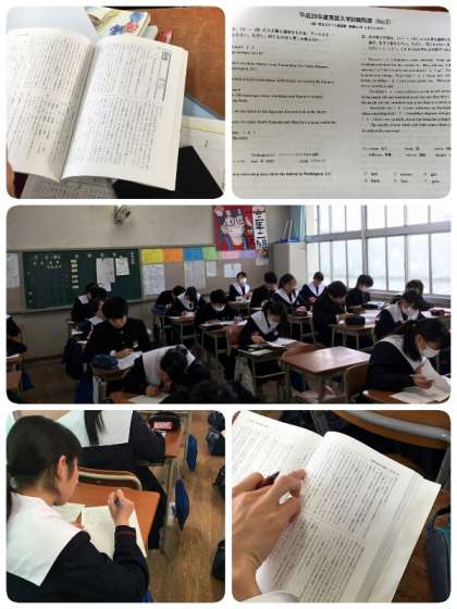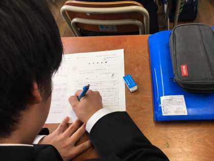 3年生は6時間目、来週末に控えた私立高校入試やその後の公立特別選抜に向けて、過去問に繰り返し挑戦したり、何度も修正を重ねてきた自己申告書の清書に取り組みました。