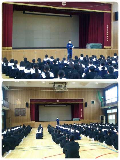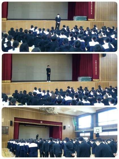 足立先生からはまず、19日に行う百人一首大会についての説明がありました。その後、「大多数の人は守れていますが、校内でのルールを守れない人がいます。指導の時には「みんな我慢しているのに、そういうズルいことをするな。」とよく言いますが、ルールを守っている人には、そういう良くないことをしている人たちに対して「そういうことはアカンやろ!」と言えるようになってほしいと思います。言ったら、今度は自分が言われるのではないかという気持ちもあるかも知れませんが、正しいことを言っているのであれば、そこは凛としていてほしいと思います。」という話がありました。
