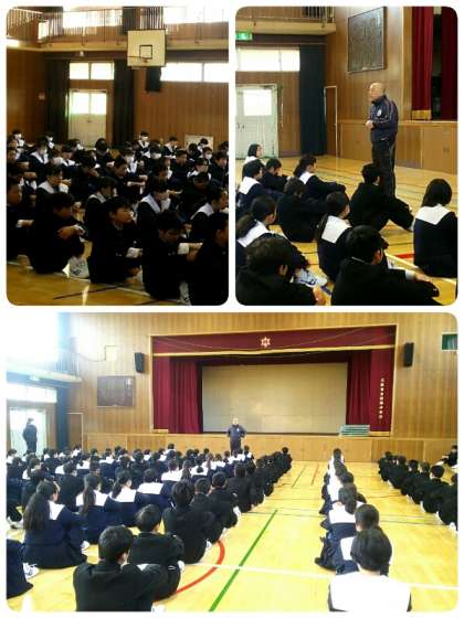 河野先生からは「寒いなぁ、と思っていても気が付けばもう3月。空を見上げると雲もなく晴れ渡り、気持ちがいいなと思います。4月に入学してきたみんなも、すぐに2年生。色々とあったけれど、もう怒られるようなことのないようにしてほしいと思います。」「話は変わって、みんな3月11日はどういう日か知っていますか?7年前に東日本大震災が起こった日です。予想もしていなかった大きな揺れの地震に津波、その甚大な被害の状況がテレビの画面に次々と映し出されました。地震が起きて7年が経とうとしていますが、被災地ではそのことが段々と風化してきているのでは?という思いを持っている人も多くいるようです。でも、地震はいつどこで起こるかわかりません。この摂陽中学校も、いざという時には避難所としての役割を担うことになります。そのため、中学校には毛布や水が備蓄されているのですが、期限が近づいているため入れ替えをすることになりました。今回、今まで備蓄されていた水を1本ずつ配ります。家に持ち帰った際、もし震災が起きた時、家族ではどのような行動を取るかなど、この機会に話をしてみてください。」という話がありました。