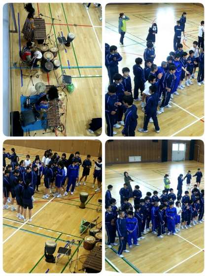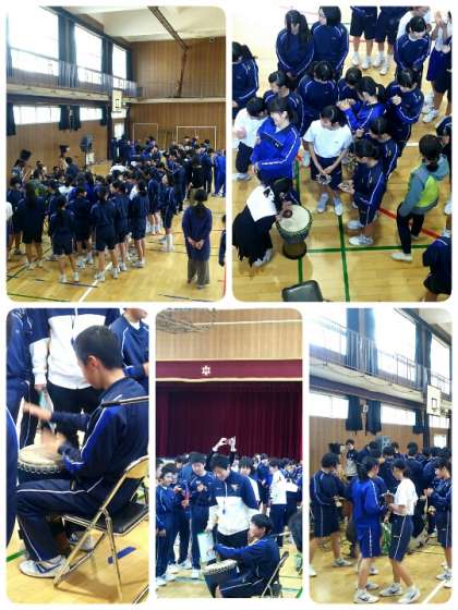 1年生の体育の授業の様子ですが、1年生では本日から全3回の予定でアフリカンダンスの講習を受けます。ただ単にダンスを踊るということではなく、アフリカの文化や伝統楽器についてもレクチャーをしていただきます。
