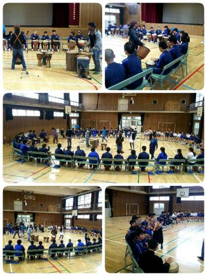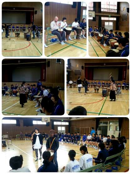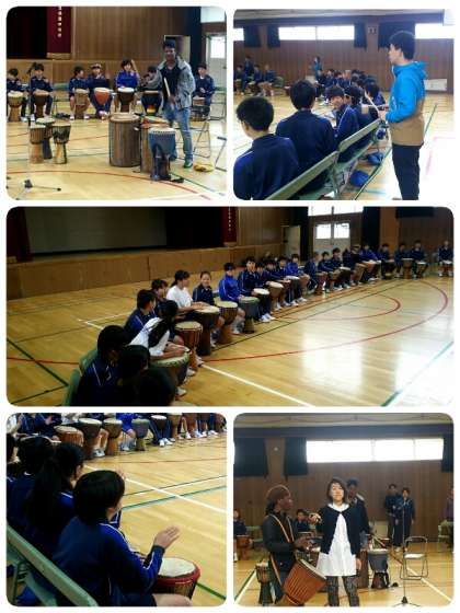 色々な種類の楽器を実際に打たせてもらいました。2クラスが輪になって、講師の先生のリズムを真似したり、順番に即興でリズムを打ってみたり、体育館にはとても大きな音が響き渡っていました。今回はダンスというより音楽といった感じでしたが、次回は実際にダンスをするようです。