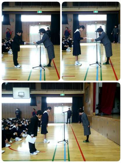 校長先生から今年度の修了証が1年生、2年生それぞれの代表の人に手渡されました。