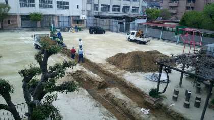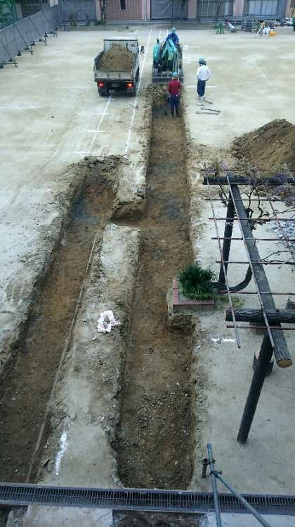 本日、入学式のあと、北館と南館をつなぐ仮設の渡り廊下をつくるための掘削工事が始まりました。遺跡発掘調査のような光景でしたが、ショベルカーが中庭を掘り進めていきました。