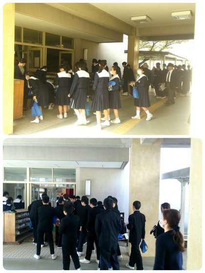 8時頃から登校してきた2・3年生には学年の先生方からクラス分けの用紙が配布され、その用紙を見ながら歓声をあげていました。