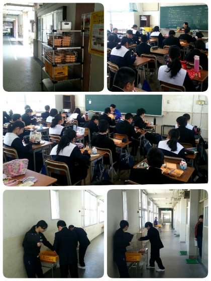本日から昼食も始まりました。1年生にとっては中学校で初めて食べるお昼ごはんになります。お弁当持参の人、給食を頼んでいる人が混在しますが、今日の給食はハンバーグでした。