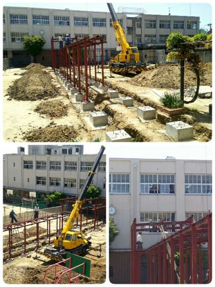仮設渡り廊下の柱が南館側から順に組み立てられました。