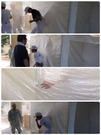 まずは煙体験。煙(無害)の充満した中を通り抜ける体験ですが、中は全く視界が効かず手探りで、周りの壁を伝いながら進みます。