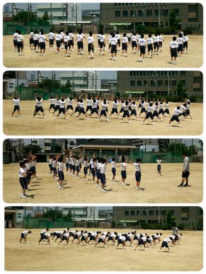 3時間目、体育の授業でグラウンドの方から元気な声が聞こえて来たので外に出てみると、1年生が行進やラジオ体操を元気よくしていました。