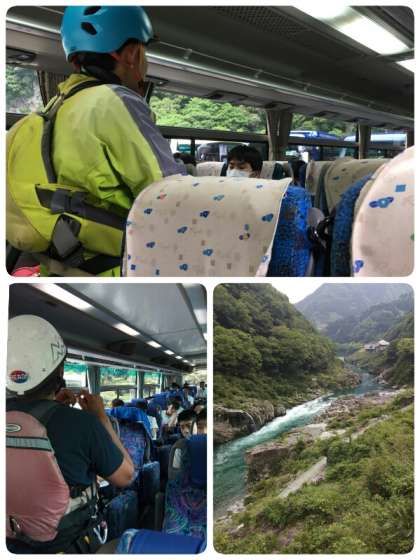 食後、バスに乗り込みラフティングについて、インストラクターの方から説明を受けました。