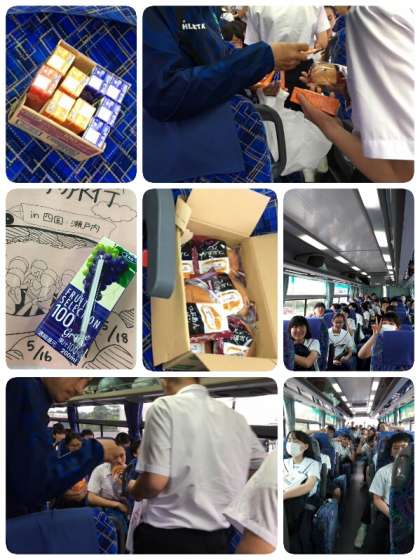 吉備サービスエリアでは補食のパン(あんパン、クリームパン、メロンパンから)1つ、ジュース(オレンジ、グレープ、アップルから)1つ、ハッピー○ーン1つが配られました。