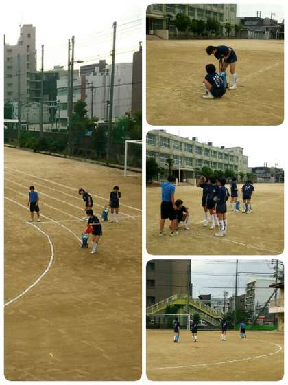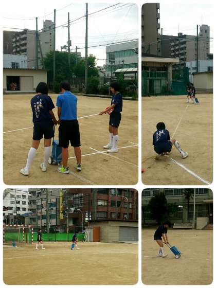 何度か学年練習を進めてきましたが、雨などですっかりグラウンドのラインが消えてしまったので、明日のために女子バレーボール部の人たちがラインを引いてくれました。