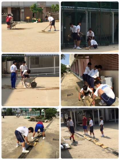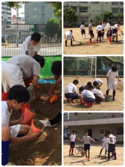 昨日の豪雨でグランド状態が良くなく、朝からサッカー部、ハンドボール部が頑張ってくれています。