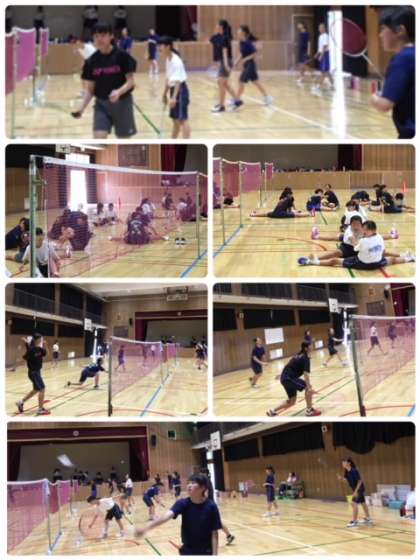 体育館ではバドミントン部が、しっかりストレッチ、準備運動の後、暑さに負けず頑張っています。