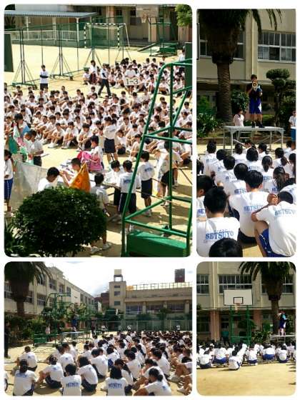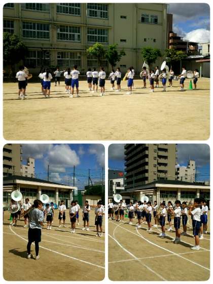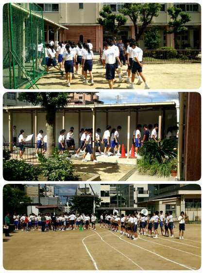 入場行進の前、中庭に全員集合しました。演奏する吹奏楽部は北グラウンドでみんなが移動してくるのを待ちます。