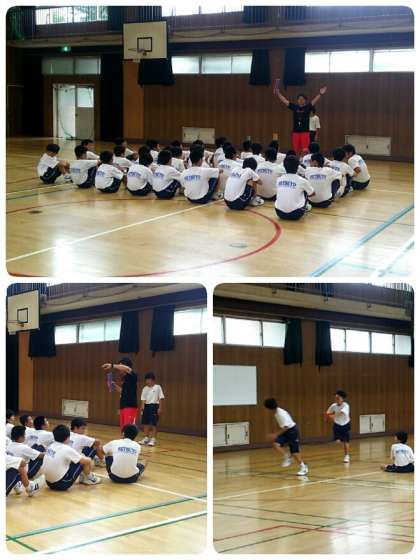 本来はグラウンドで行うはずでしたが、雨天のため体育館での授業となりました。