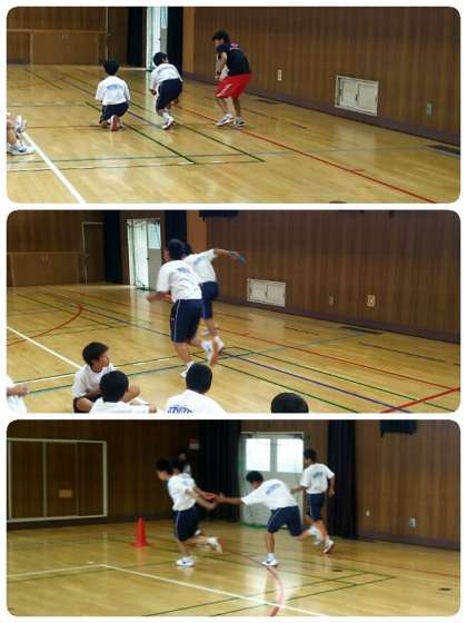 狭い中ではありましたが、みんな一生懸命取り組んでいました。実習生の先生が見本でバトンパスを受け取って走ると、そのダッシュ力にみんな「おぉ〜っ」とどよめいていました。