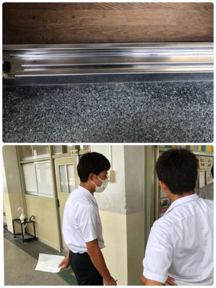 教室のドアのレール部分は砂が溜まりやすいですが、ほうきだけでなく、ハケや歯ブラシを使ってレールの砂を取り除いていました。