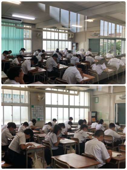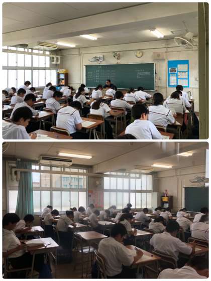 2年生は、宿題テストです。定期テストでは1日5時間のテストという機会はありませんが、本日は5時間のテストに取り組んでいます。1月にあるチャレンジテストや3年生の実力テストは5時間のテストです。しっかり慣れてほしいです。