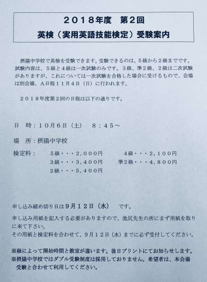10月6日(土)に本年度2回目の英語検定を学校で行います。
