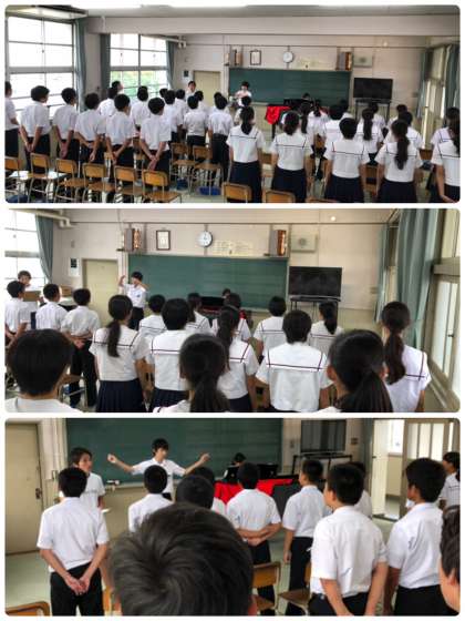 2年1組と3組です。音楽室と体育館で歌いました。