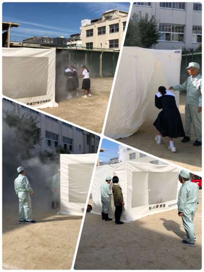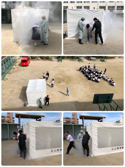 1年生は、煙テントの中を通り抜ける体験と水消火器を使った消火訓練を行いました。