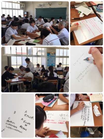 まずは各自根拠を示しながら自分の意見を文章にまとめ、班で互いに意見を発表し、話し合いました。