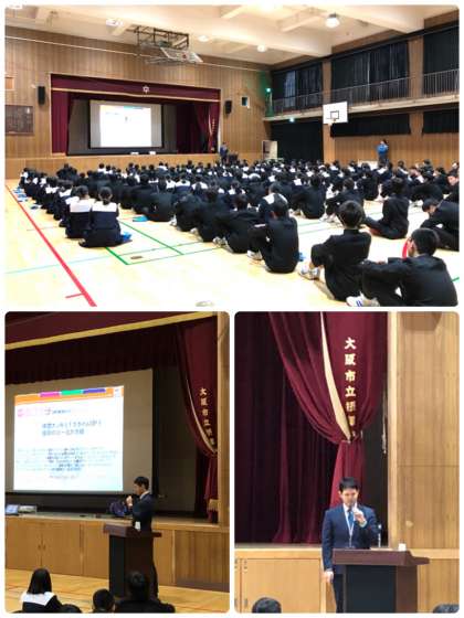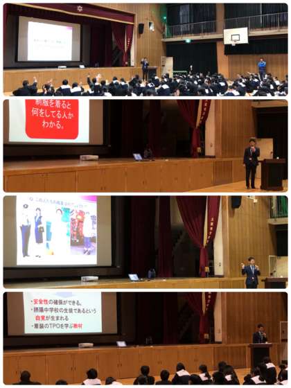 本日6時間目、3年生は企業から講師を招いて、着こなしについての講話を聴きました。