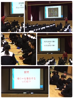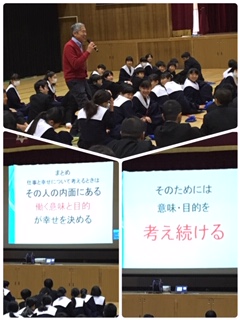 本日1時間目に、ヒューマンキャンパス高等学校から講師をお招きして、「働くこと と 幸せ」についてお話しいただきました。