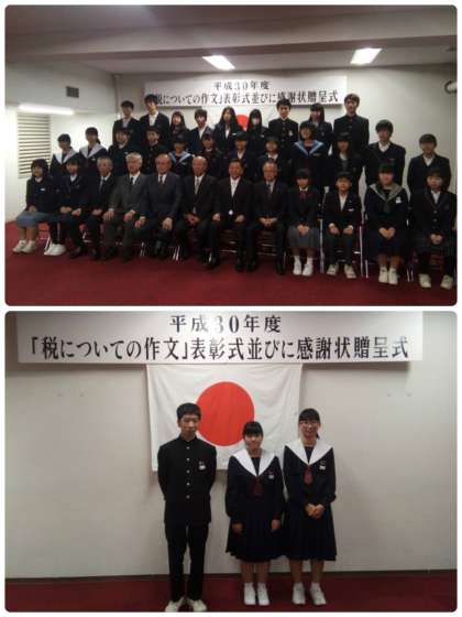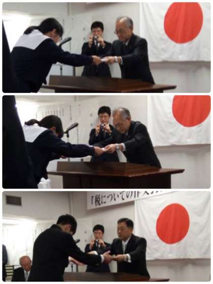 本日、東住吉納税協会で「税についての作文」の表彰式並びに感謝状贈呈式がありました。本校からは3年生の女子2名がそれぞれ「近畿税理士会東住吉支部長賞」を、男子1名が「東住吉・平野地区租税教育推進協議会長賞」をいただきました。