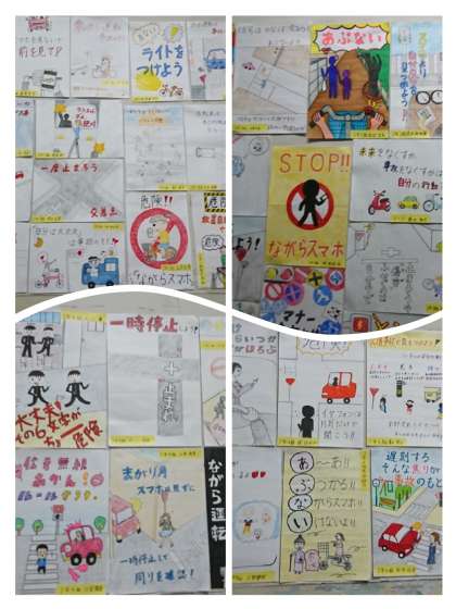 先日2年生女子保健体育の授業で制作した「交通安全ポスター」を北館西階段に掲示しております。